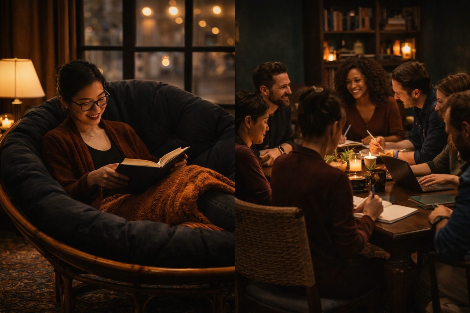 Quill offers a welcoming creative lounge designed for writers and creators. Members gather to journal, draft stories, explore ideas, and spend time in thoughtful creative flow. The environment encourages focus, imagination, and the quiet momentum that helps ideas take shape.