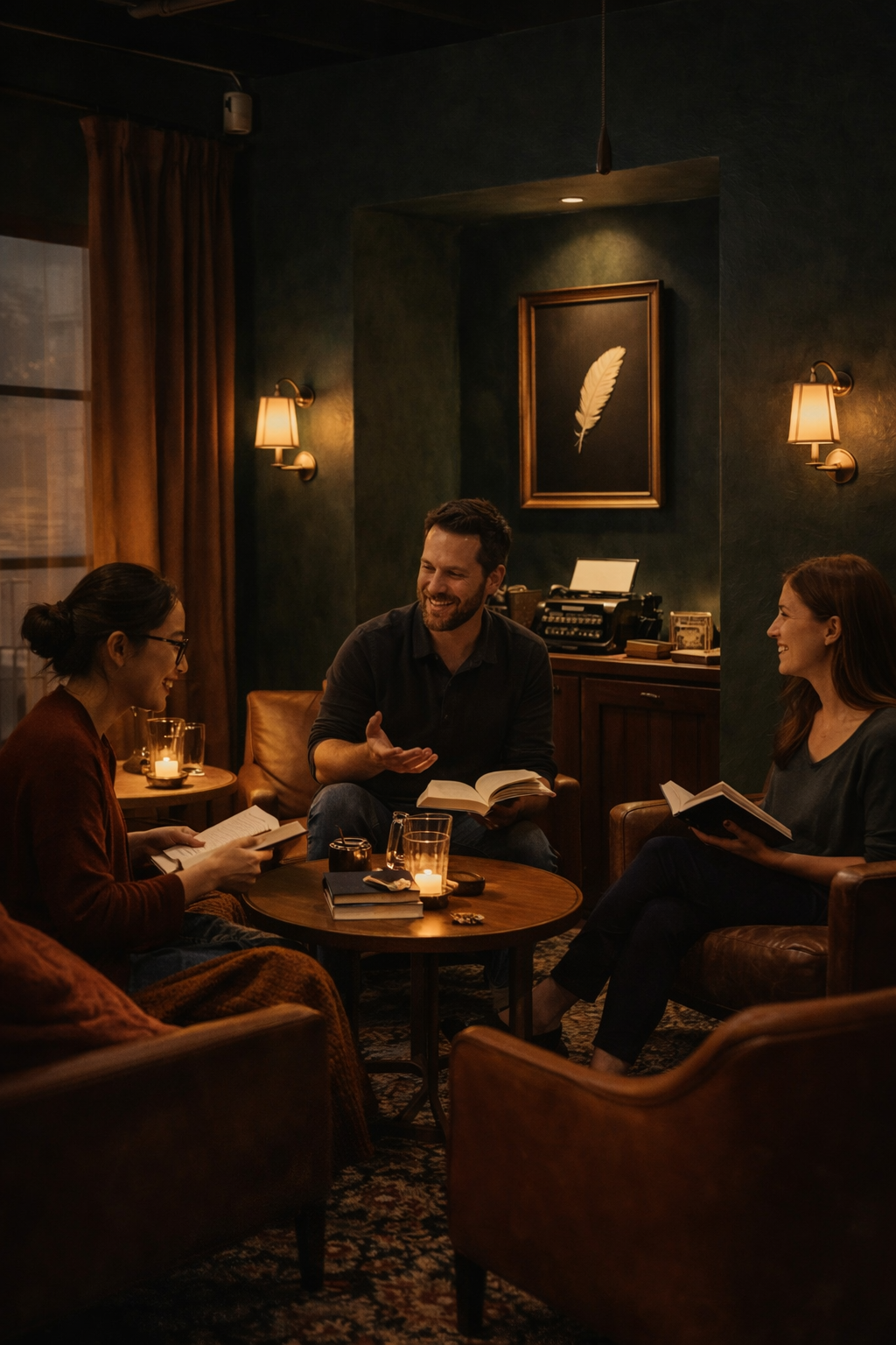 Members enjoy a creative lounge for writing and reflection, opportunities to meet other storytellers and artists, workshops and gatherings that spark ideas, and flexible memberships that invite people to become part of the Quill community.